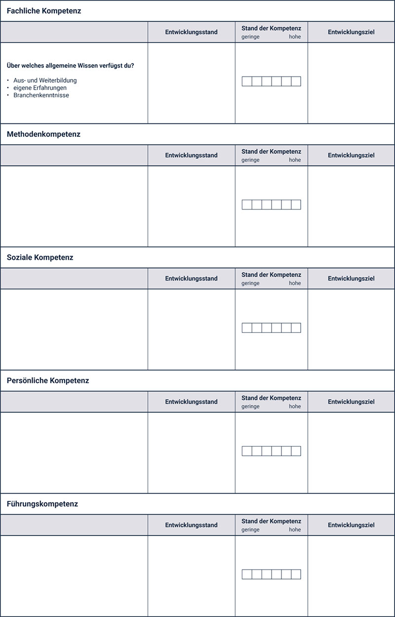 Die Einschätzung der eigenen Kompetenzen ist Voraussetzung, dass sich Personen überhaupt weiterentwickeln können. Am effektivsten ist eine Einschätzung der eigenen Person durch sich selbst und durch einen anderen. In Ihrem Falle schätzt sich der Mitarbeiter selbst ein und Sie schätzen ihn ein. Darauf aufbauend kann der Mitarbeiter sich weiterentwickeln und Sie können ihn fördern. Das hängt natürlich auch davon ab, für welche Aufgaben Sie ihn in Zukunft vorsehen und wohin sich der Mitarbeiter in Ihren, aber auch in seinen Augen entwickeln sollte. Für die Einschätzung der eigenen Kompetenzen ist es natürlich wichtig, welche Kompetenzen der Mitarbeiter für seine Aufgaben überhaupt vorweisen muss. Diese Kompetenzen gilt es festzulegen und in die Kategorien zu unterteilen. Da wären zum einen die fachliche, methodische und soziale Kompetenz sowie die persönliche bzw. Selbstkompetenz. Falls Ihr Mitarbeiter auch Führungsverantwortung hat, gehört auch die Führungskompetenz dazu. Innerhalb der Kompetenzen gibt es natürlich verschiedene Ausprägungen, die für Ihren Mitarbeiter mehr oder weniger wichtig sind. Nehmen wir die sozialen Kompetenzen: Hier gibt es Kontakt-, Kommunikations- oder Teamfähigkeit, Hilfsbereitschaft, Konflikt- oder verkäuferische Fähigkeiten und die Durchsetzungskraft. Es gilt die 3-4 wichtigsten Kompetenzen zu identifizieren, die entwickelt werden sollen. Wichtig ist nun, dass Sie und ihr Mitarbeiter getrennt den aktuellen Entwicklungsstand beschreiben, ob die Kompetenz gering oder hoch ausgeprägt ist und wohin er sich entwickeln möchte/soll. So könnte ein solcher Entwicklungsplan aussehen: