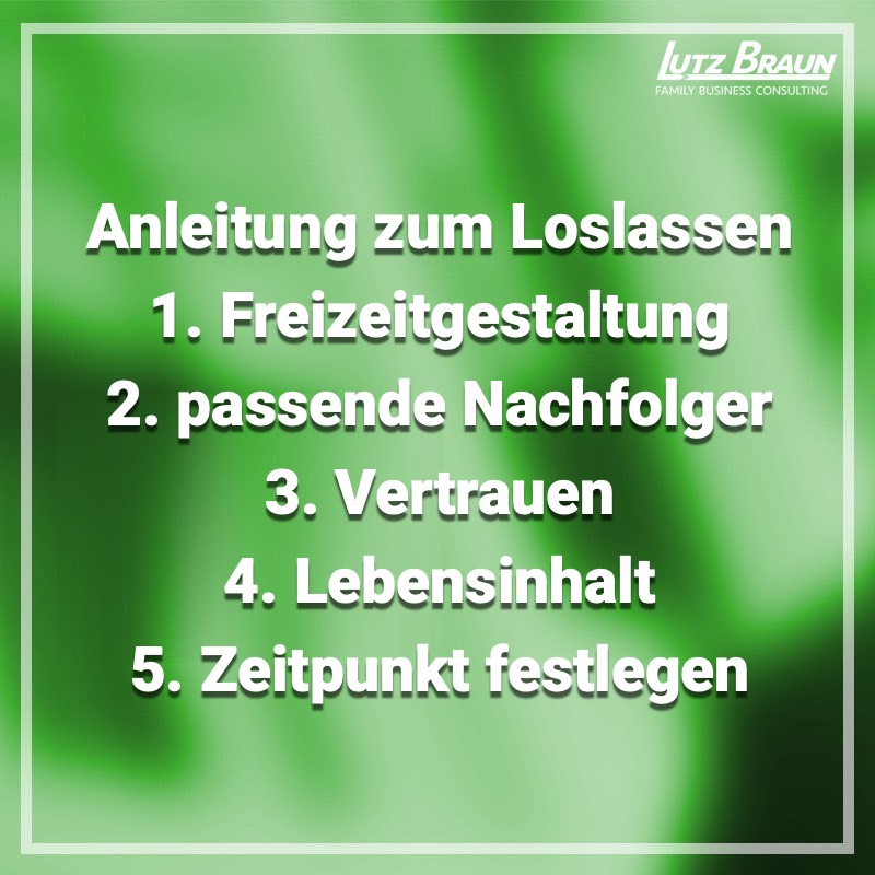 Weil Sie nichts mit Ihrer freien Zeit anzufangen wissen, weil Sie dem Nachfolger noch nicht vertrauen oder weil Sie einfach Angst davor haben, dass das Unternehmen ohne Sie an die Wand fährt. Denn für den Nachfolger ist es natürlich viel motivierender, wenn er weiß, wie lange Sie im Unternehmen bleiben und wann Sie endgültig ausscheiden. Aus diesem Grund machen Sie sich bereits jetzt Gedanken, wie Sie denn Ihre Freizeit gestalten möchten. Sie überlegen sich, wie Sie neben Ihrem Lebensinhalt Unternehmen auch einen anderen Lebensinhalt haben können. Gönnen Sie sich mehr freie Zeit mit Ihrer Familie, Sie haben es sich verdient. Gestalten Sie Ihre Freizeit bewusst, dass Sie auch nach der Führung des Unternehmens noch wissen, was Sie machen können. Seien Sie sich im Klaren, dass der Nachfolger Ihnen nicht die Firma wegnimmt, sondern Ihr Lebenswerk weiterführt und Sie deshalb peu á peu loslassen können.