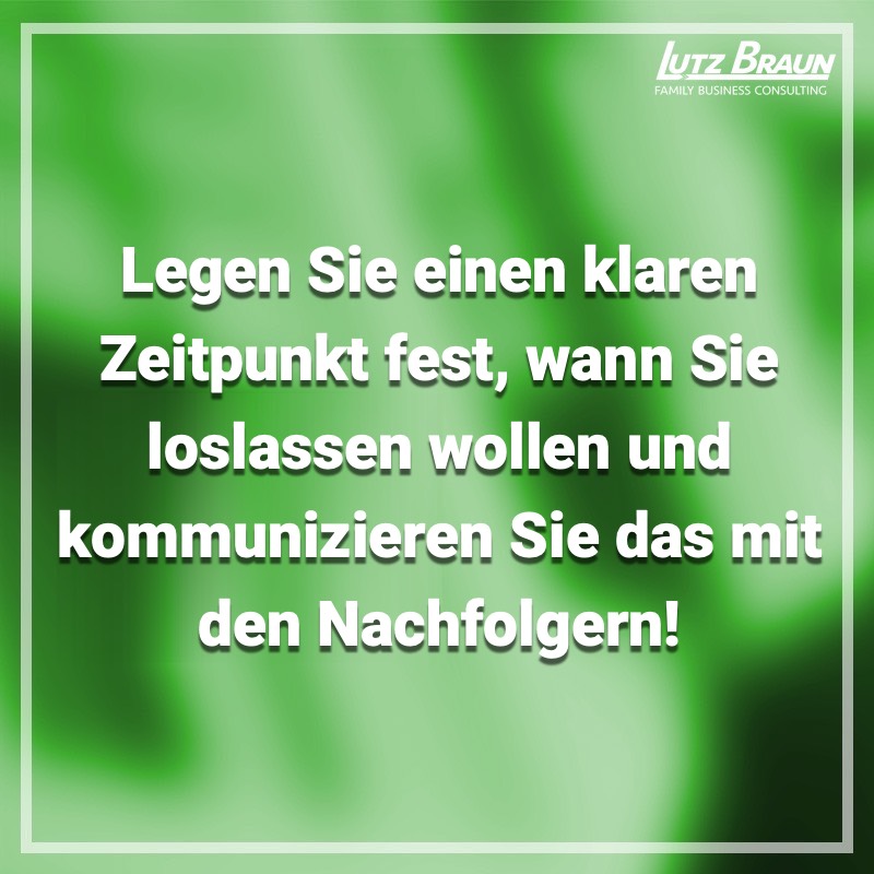 Weil Sie nichts mit Ihrer freien Zeit anzufangen wissen, weil Sie dem Nachfolger noch nicht vertrauen oder weil Sie einfach Angst davor haben, dass das Unternehmen ohne Sie an die Wand fährt. Denn für den Nachfolger ist es natürlich viel motivierender, wenn er weiß, wie lange Sie im Unternehmen bleiben und wann Sie endgültig ausscheiden. Aus diesem Grund machen Sie sich bereits jetzt Gedanken, wie Sie denn Ihre Freizeit gestalten möchten. Sie überlegen sich, wie Sie neben Ihrem Lebensinhalt Unternehmen auch einen anderen Lebensinhalt haben können. Gönnen Sie sich mehr freie Zeit mit Ihrer Familie, Sie haben es sich verdient. Gestalten Sie Ihre Freizeit bewusst, dass Sie auch nach der Führung des Unternehmens noch wissen, was Sie machen können. Seien Sie sich im Klaren, dass der Nachfolger Ihnen nicht die Firma wegnimmt, sondern Ihr Lebenswerk weiterführt und Sie deshalb peu á peu loslassen können.